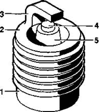 Рис. 1. Основные элементы свечи зажигания: 1 — резьба; 2 — торец корпуса (ободок): 3 — боковой электрод: 4 — центральный электрод; 5 — тепловой конус изолятора («юбочка»)