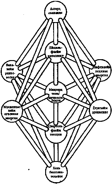 Асгард (Asgardhr) -- это царство асов (AEsir), а также тех ванов (Vanir), которые живут вместе с асами. Хель (Hel) -- царство мертвых, а также сил вселенского разрушения. Лёссальфхейм --------------------- (Ljossalfheimr) - цаpство альвов-эльфов (полубогов и обожествленных духов предков). Это измерение соответствует структурам интеллекта. Ему противопоставляется Свартальфхейм ------------------- (Svartalfheimr). Свартальвы-сваpтэльфы - то же, что " карлики" -цвеpги Дp.-исл. dvergar, нем. Zwerge, англ. dwarves (название, котоpое Дж. Р. Р. Толкин использовал для своих " гномов"). Карлики, как и лайтальвы, являются духами предков и полубогами, но они лишены интеллекта и духовности. Они олицетворяют мировые силы, придающие вещам форму и структуру. Ванахейм ----------------------- (Vanaheimr) -- царство ванов, о которых мы позже поговорим более подробно. Ему противопоставлен миp ётунов - Ётунхейм -------------------- (Jotunheimr). Это царство первобытных сил слепого, бессознательного хаоса и/или порядка. Ётун -- это конструкция, лишенная сознания. ----------------- (Muspdellsheimr) и Нифльхейм ------------- (Niflheimr) соответственно представляют собой сферы Космического Огня и Космического Льда. Именно из этих космических полярностей вещества-энергии зародилась вселенная. Между этими полярными силами находится благословенная земля Мидгард --------------- (Midhgardhr) -- замкнутый миp в сеpедине Большого миpа. В этом " Среднеземье" живет человечество -- один из многочисленных видов космических существ, потенциально обладающий наравне с богами и богинями даром сознания. Душа Тевтонская мифология повествует о том, что первые мужчина и женщина были созданы из деревьев триадой богов сознания (Вотаном-Вилли-Ве или Одином-Хениром-Лодуром). Мужчина был создан из ясеня, женщина -- из вяза. В поэзии Севеpа люди часто сравниваются с деревьями. К примеру, воина называли " дубом битвы". Это указывает на важную связь между идеей космического древа (Иггдрасиля) и деревом на индивидуальном человеческом плане. Многомерная формула существования, отображенная в модели Древа Иггдрасиль, представляет собой и основу человеческого бытия. Они не дышали, в них не было духа, (Перевод А. Корсуна.)