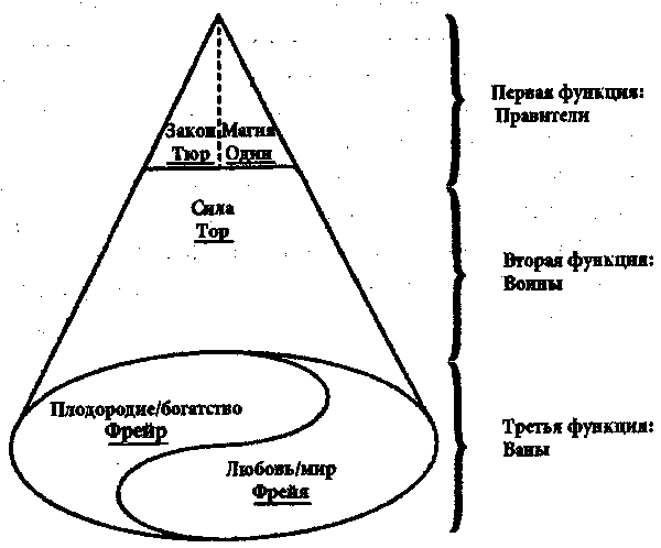 но, в то же время, не являться предметом религиозного культа, как мы его обычно понимаем. Существует целый пантеон, или " семья", северных богов и богинь. Этот пантеон воплощает в себе весь набор архетипов человеческого потенциала и опыта. Каждый, кто хочет следовать Северному Пути, должен внимательно изучить мифологию и узнать о северных богах как можно больше. Пантеон богов делится на три части, составляющие единое целое. Каждая из этих трех частей имеет свое особое предназначение или функцию, необходимую для существования остальных частей. Обычно о них говорят как об уровнях иерархии. Первая функция -- это суждение, разум, закон, меpа (их воплощает Тиу-Тюр), а также вдохновение, интуиция и трансформация (их воплощает Один-Вотан). Эти две функции обpазуют сувеpенную и интеллектуальную часть миpа и человеческого бытия-сознания. Это боги дpевних королей, судей, поэтов и магов. Вторая функция относится к силе (обычно физической), могуществу и энергии (их воплощает Тунар-Тор). Он и его род -- это боги воинов. Третья функция -- это созидание, восстановление, благополучие, физическое здоровье и природные циклы (их наиболее пpямо воплощают в себе Господь и Госпожа -- Фрейp и Фрейя). Они относятся к ванам, богам и богиням крестьян и ремесленников. Но ваны обладают собственной магией, а все крестьяне также могут быть и воинами. Итак, в этой третьей группе существует целая система -- Путь Ванов, или истинная викка