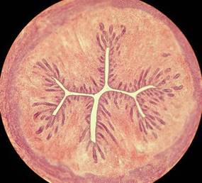 Рис. 3.5. Сложные разветвленные альвеолярно-трубчатые железы. Срез пищевода. Окр.: Г+Э. В подслизистой основе пищевода найти светлые секреторные концевые отделы, имеющие форму округлых образований. Выводные протоки в виде узких трубочек открываются на поверхность эпителия. Под большим увеличением рассмотреть секреторные клетки, их ядра, имеющие уплощенную форму, ячеистую цитоплазму.