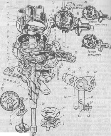 Рис. 12.3. Прерыватель –распределитель а-общее устройство; б-вид сверху без крышки и ротора; е-режим работы вакуумного регулятора; г-октан-корректор; д-центробежный регулятор Устройство и принцип работы прерывателя-распределителя лучше рассмотреть на приборе контактного типа (рис. 12.3). В корпусе 25 запрессованы две меднографитовые втулки 31, служащие подшипником валика 29 привода кулачковой муфты 8 прерывателя, ротора 10 распределителя и центробежного регулятора. Валик 29 получает вращение от валика привода смазочного насоса. Прерыватель смонтирован на подвижном диске 4, который установлен на шарикоподшипнике 2, запрессованном в отверстие неподвижного диска 3, прикрепленного к корпусу 25. Диски 4 и 3 связаны между собой гибким медным проводом 5 для повышения надежности соединения подвижного диска с «массой». Подвижный контакт 18 на текстолитовой колодке 17 установлен на оси, закрепленной на подвижном диске 4, и изолирован от «массы». Под действием пластинчатой пружины 16 подвижный контакт прерывателя прижат к неподвижному 19, закрепленному на кронштейне и соединенному с «массой». Контакты изготовлены из вольфрама. Кронштейн вместе с неподвижным контактом может быть повернут винтом 37 (рис. 12.3, 6) эксцентрика с помощью которого регулируют зазор между контактами (0, 35 - 0, 45). Зазор проверяют плоским щупом и регулируют при максимальном разрыве контактов. После регулировки зазор фиксируют стопорным винтом 38. Подвижный контакт 18 (рис. 12.3, а) через пружину 16 и провод 5 соединен с изолированной клеммой 7 корпуса, к которой присоединяется провод низкого напряжения от катушки зажигания. Для смазки граней кулачковой муфты 8 и верхнего конца валика имеются войлочные фители 9 и 6, а для смазки втулок 31-колпачковая масленка 28. Параллельно контактам включен конденсатор 34. Одна из его обкладок соединена с «массой», а другая с клеммой 7 прерывателя-распределителя. Конденсатор (рис. 12.4) состоит из корпуса 7, в который помещен рулон 4, состоящий из двух обкладок 9 из олова и цинка, нанесенных тонким слоем на листы бумаги 8. Слой металлов нанесен не по всей ширине бумаги. На торцы рулона 4 напылен припой, к которому припаяны гибкие провода 2 и 5. Рулон 4 обернут кабельной бумагой 6. Проводник 5 пропущен через отверстия в корпусе 7 и припаян к нему. Проводник 2 от другой обкладки припаян к латунному выводу в текстолитовой шайбе 1. Шайбы 1 и 3 обеспечивают герметичность корпуса. Свободное пространство в корпусе заполнено трансформаторным маслом.
