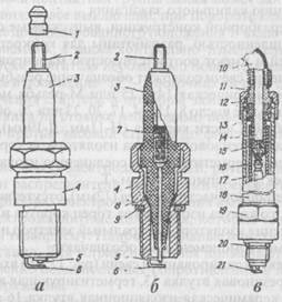 Рис. 12.5.Свеча зажигания а - общий вид; б - свеча в разрезе; в - экранированная свеча; 1 - контактная гайка; 2 - стержень; 3 - изолятор; 4 и 19 - корпуса; 5 - центральный электрод; 6 и 21 - боковые электроды; 7 - герметик; 8 - шайба; 9 - уплотнительное кольцо; 10 - экранировка провода; 11 - втулка; 12 - накидная гайка; 13 - резиновая втулка; 14 - провод высокого напряжения; 15 - контактное устройство; 16 - керамическая втулка; 17- подавительный резистор; 18 - экран; 20 - кольцо Свечи работают в очень тяжелых условиях, подвергаясь действию высокого напряжения (до 25 кВ), высокому давлению газов (до 4 мПа) и изменению температур от 40 до 2500°С. Чтобы обеспечить бесперебойную работу свечи, нижняя часть теплового конуса изолятора должна иметь температуру в пределах 500-600°С. При такой температуре сгорает нагар, откладывающийся на тепловом конусе изолятора, т.е. происходит самоочищение свечи. При меньшем нагреве электроды свечи будут покрываться нагаром. Свеча в этом случае будет работать с перебоями. При слишком высокой температуре изолятора и центрального электрода (более 800°С) возникает калильное зажигание, когда рабочая смесь воспламеняется от соприкосновения с накаленным конусом изолятора и центрального электрода до появления искры между электродами свечи. В результате происходит слишком раннее воспламенение рабочей смеси. Характеристикой тепловых качеств свечи является калильное число, которое определяется на специальной установке по возникновению калильного зажигания. Свечи неразборной конструкции, выпускаемые отечественной промышленностью, разработаны для конкретных типов автомобилей и имеют соответствующую маркировку. Условное обозначение свечи содержит обозначение резьбы на корпусе (А-резьба метрическая 14x1, 25 или М-резьба метрическая 18x1, 5), калильное число 8, 11, 14, 17, 20, 23 или 26, обозначение длины резьбовой части корпуса (Н-11мм, Д-19мм), обозначение выступания теплового конуса изолятора за торец корпуса В, обозначение герметизации по соединению изолятор - центральный электрод термоцементом -Т. Длину резьбовой части корпуса (12мм), отсутствие выступания теплового конуса изолятора за торец корпуса и герметизацию соединения изолятор - центральный электрод иным герме-тиком, кроме термоцемента, не обозначают. В комплект экранированной свечи (рис. 12.5, в) входят уплотнительная резиновая втулка 13, герметизирующая ввод провода в свечу, керамическая изоляционная втулка 16 экрана, уплотнительное медное кольцо 20 и керамический вкладыш со встроенным подавительным резистором 17. Этот резистор предназначен для снижения уровня радиопомех системой зажигания и уменьшения выгорания электродов свечей. Контакт провода с электродом осуществляется с помощью контактных устройств типа КУ-20А. Соединение выполняется следующим образом. На конец провода 14 высокого напряжения, выходящего из экранированного шланга 10, надевается резиновая уплотнительная втулка 13 свечи, а затем провод вводится в контактное устройство. Жила провода, оголенная на длине 8мм, вставляется в отверстие втулки, развальцованной в донышке керамического стаканчика контактного устройства 15, и распушается так, чтобы контактное устройство было зажато на проводе. Свечи такого типа (СН-307) устанавливаются на автомобилях ЗИЛ-131. Выключатель зажигания. Этот прибор предназначен для включения и выключения приборов зажиг