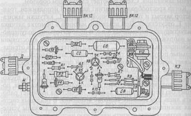 Рис.12.8. Транзисторный коммутатор ТК-200. - Д-для соединения с низковольтным выводом датчика-рас - КЗ-для соединения с выводом Р катушки зажигания; - ВК-12-для соединения с выводом В К катушки зажигания; - ВК-12-для соединения с разъемом фильтра подавления радиопомех ФР82; - вывод М-для соединения с корпусом автомобиля. Распределитель Р351 (рис. 12.9) служит для управления работой транзисторного коммутатора и распределения высокого напряжения по свечам зажигания в порядке работы цилиндров двигателя. Ротор 13 магнитоэлектрического датчика импульсов состоит из кольцевого магнита 24 и двух 8-полюсных магнитопроводов 23. Ротор закреплен на втулке 11 поводковой пластины 25 центробежного регулятора опережения зажигания. Статор 12 датчика состоит из двух стальных магнитопроводов 20 и 22, имеющих по восемь выступов, и обмотки 21, намотанной на изоляторе в виде катушки. Обмотка закреплена между полюсными наконечниками, один конец ее соединен с корпусом, другой-с изолированным выводом. Распределитель высокого напряжения состоит из крышки и ротора обычной конструкции.