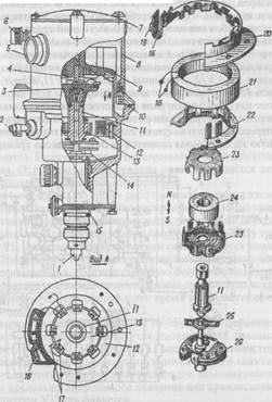 Рис. 12.9. Распределитель зажигания Р-351: 1-валик; 2-штуцер; 3-ротор; 4-контактный уголек; 5-патрубок экрана; 6-муф-та; 7-крышка экрана; 8-экран; 9-крышка распределителя; 10-прокладка; 11-втулка; 12-статор; 13-ротор; 14-грузики; 15-прокладка; 16-пластина; 17-ус-тановочные метки; 18-выводы обмотки статора; 19-пласмассовая колодка; 20 и 22-магнитопроводы; 21-обмотка статора; 23-магнитопровод; 24-постоянный магнит; 25-поводковая пластина; 26-палец