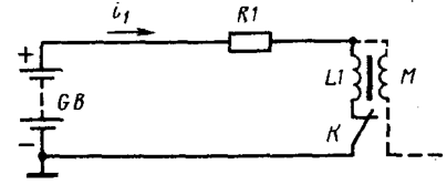 На 1-м этапе вторичная цепь практически не влияет на процесс нарастания первичного тока. Токи и напряжения во вторичной цепи при относительно малой скорости нарастания первичного тока незначительны. Вторичную цепь можно считать разомкнутой. Первичный конденсатор замкнут накоротко контактами К. Схема замещения для данного рабочего этапаприведена на рис. 3.16.