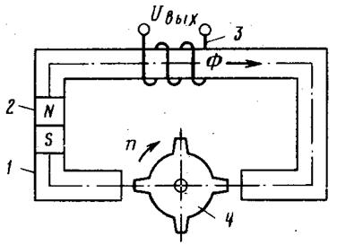 Рис. 3.29 Принципиальная схема коммутаторного датчика: 1 — магнитная цепь (статор); 2 — магнит; 3 — обмотка; 4 — распределитель потока (коммутатор)