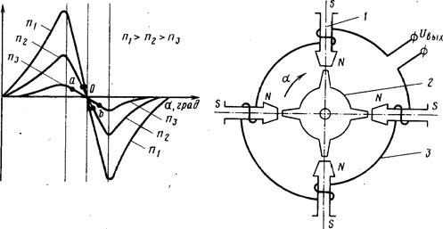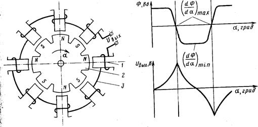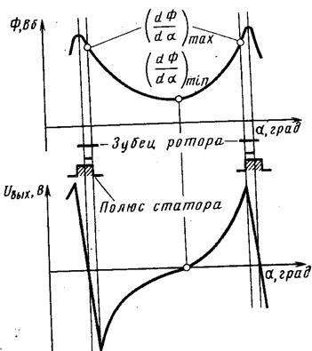 изменение потока Ф в зависимости от угла поворота. Когда один из зубцов ротора 4 приближается к полюсу статора 1, в обмотке 3 нарастает напряжение. При совпадении фронта зубца ротора с полюсом статора (со средней линией обмотки) напряжение на обмотке достигает максимума, затем быстро меняет знак и увеличивается в противоположном направлении до максимума (рис. 3.30) при удалении зубца.