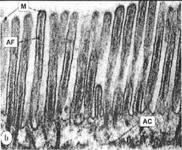 Микроворсинки эпителия тощей кишки, ТЭМ Электронная микрофотография поверхности эпителиальной выстилки тощей кишки изображает микроворсинки (М) в виде пальцевидных выростов, у которых есть стержень из активых филаментов (AF), котрый сливается с актиновой клеточной корой (АС) (терминальной сетью).