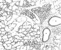Два крупных выводных протока (звездочки) проходят в строме железы. Они выстланы многослойным эпителием, что указывает на эктодермальное происхождение железы.