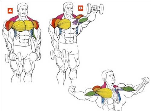 Советы по упражнению: 1. Чтобы заставить передние дельты работать в полную силу, используйте относительно тяжелые гантели и поднимайте их до уровня плеч или чуть выше. Если хотите еще сильнее ударить по дельтам, держите гантели нейтральным хватом (ладони смотрят друг на друга, и поднимайте руки на 45 градусов выше горизонтали, проходящей через плечи. 2. Передний пучок и фронтальная половина среднего пучка дельт начинают выполнять львиную долю работы с момента, когда рука отклоняется от вертикали на 45 градусов, и до момента, когда рука выше уровня плеч на те же 45 градусов. Причем, в этой верхней точке передние дельты сокращаются по максимуму. Если вы поднимаете гантели еще выше, то фокус нагрузки смещается на трапеции и переднюю зубчатую мышцу. Упражнение также сильно задействует верх грудных мышц, но только до тех пор, пока гантели не поднялись выше уровня плеч. 3. Чтобы сильнее сфокусировать нагрузку на передние дельты, держите гантели хватом сверху. 4. Не помогайте себе корпусом сдвинуть гантели с места в начале подъема, отклоняя плечи назад и/или толкая таз вперед. Лучше возьмите гантели полегче. 5. Вариация упражнений: попеременные подъемы гантелей, с чередованием рук; подъемы штанги перед собой; подъемы рук перед собой в блочном тренажере (рукоятка крепится к нижнему блоку). Все упражнения делайте в умеренном темпе.