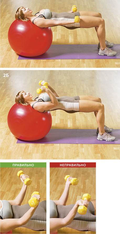 Ляг на фитбол так, чтобы голова и плечи опирались на его поверхность. Корпус держи прямо, а ноги – почти под прямым углом к корпусу. Вытяни руки с гантелями вдоль туловища и разверни их так, чтобы тыльная сторона ладоней была направлена вниз (2А). Медленно согни локти и приблизь гантели к плечам (2Б), затем снова распрями их. Не отрывай голову от поверхности мяча. Бицепс сгибает руку в локтевом суставе, вращает предплечье.