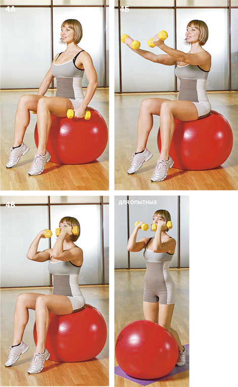 Упражнение для разработки мышц верхней части рук Сядь на фитбол, поставь ноги на ширину плеч, держа спину прямо и втянув живот (4А). Если у тебя уже есть опыт подобных тренировок, усложни задачу: упрись коленями в мяч. Возьми гантели и опусти руки вниз – это будет исходным положением. Вытяни руки перед собой, развернув ладонями вверх (4Б), медленно согни локти и приблизь гантели к плечам (4В), а затем опусти. Потом вернись в исходное положение. Отработай упражнение с легкими гантелями и, только когда освоишь все движения, переходи к более серьезному отягощению.