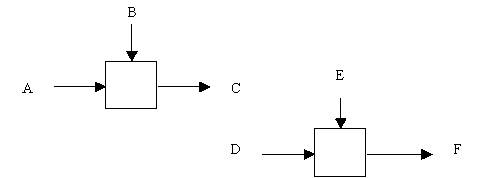 Рис.10 Коммуникационная связность Тип последовательной связности. На диаграммах, имеющих последовательные связи, выход одной функции служит входными данными для следующей функции. Связь между элементами на диаграмме является более тесной, чем на рассмотренных выше уровнях связок, поскольку моделируются причинно-следственные зависимости. Тип функциональной связности. Диаграмма отражает полную функциональную связность, при наличии полной зависимости одной функции от другой. Диаграмма, которая является чисто функциональной, не содержит чужеродных элементов, относящихся к последовательному или более слабому типу связности. Одним из способов определения функционально-связанных диаграмм является рассмотрение двух блоков, связанных через управляющие дуги, как показано на рисунке 11).