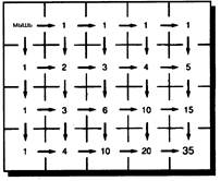 Пентаграмма. На пентаграмме содержится тридцать пять треугольников. Чтобы найти правильный ответ, вы можете попробовать просто сосчитать треугольники или использовать систематический подход. Поскольку фигура симметрична, можно выбрать базовую точку и посчитать количество треугольников, связанных с этой точкой. Для каждой точки пятиугольника существует семь связанных с ней треугольников, которые не дублируются при выборе следующей точки. Поскольку точек пять, а треугольников для каждой точки семь, всего здесь содержится тридцать пять треугольников. Семь мужчин и два мальчика. Эту задачу можно решить по составленной предварительно схеме. Сначала реку пересекают два мальчика. Один из них возвращается. Затем реку пересекает мужчина. Мальчик возвращается. Таким образом, чтобы переправить на другой берег одного мужчину, требуется пересечь реку четыре раза. Поскольку мужчин всего семь, для того чтобы их переправить на другой берег, нужно пересечь реку двадцать восемь раз, после чего, на двадцать девятый раз, реку переплывают два мальчика. Мышь в лабиринте. Общее число маршрутов – тридцать пять. Задачу можно легко решить, если понять, что количество маршрутов, ведущих к любому квадрату, равно сумме маршрутов, ведущих к тем двум квадратам, из которых к нему можно выйти. Чтобы посчитать возможные маршруты, используйте приведенную ниже диаграмму.