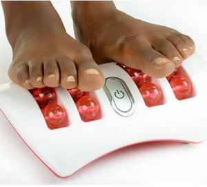 Оснащённый эффективной массирующей системой из двенадцати роликов этот замечательный массажёр предлагает пользователю достойную гамму приятных ощущений, результатом которых становится безусловная польза для всех систем организма. Известно, что именно на стопах расположены акупунктурные области, которые связаны особыми энергетическими каналами с внутренними органами, зрением и кожным покровом. Согласно убеждению целителей Древнего Востока, постоянное стимулирование этих точек способно не просто улучшать общее состояние, а благотворно влиять на здоровье в целом и даже продлевать срок жизни. Эта модель работает от обычных пальчиковых батареек, что позволяет брать массажёр с собой в длительную поездку на поезде или на природу. Управление устройством предельно просто – одно нажатие кнопки включает вибрацию массажных колёс, второе и третье – увеличивают интенсивность работы роллеров с соответствующим дублированием режима работы на световых индикаторах.