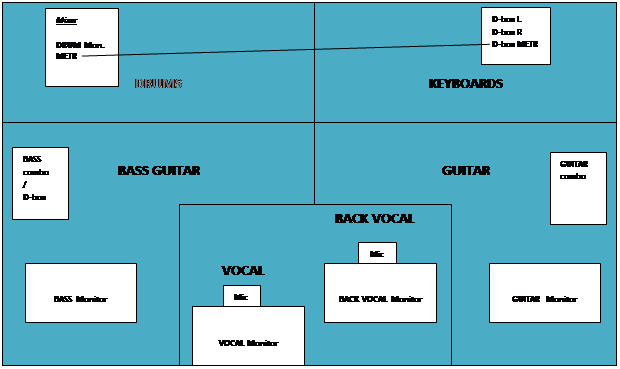 Состав: 6 человек – вокалист-саксофонист, бэк-вокалистка, гитарист, басист, клавишник, барабанщик. FOH: От 1кВт на 100 чел, в зависимости от размеров помещения. BACKLINE: Бас: комбо или стек от 50w, di-box, стойка для бас-гитары. Клавиши: Di-Box 3 шт. (один нужен для подключения метронома барабанщику), Вокал, бэк-вокал: микрофоны 2 шт., стойки для микрофонов 2 шт., пюпитр для текстов.