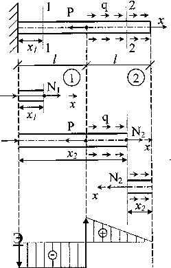 Брус имеет 2 участка 1 и 2. В пределах первого участка мысленно рассечем брус на 2 части нормальным сечением и рассмотрим равновесие, допустим левой части, введя следующую координату х1, рис.1 б: