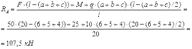 Дана двухопорная балка (рис.4.8), на которую действуют сила F = 50 кН, момент М = 25 кНм, распределенная нагрузка q = 10 кН/м, расстояние между опорами a = 6 м, b = 5 м, с = 4 м, l = 20 м. Определить реакции опор в точках А и В. Решение