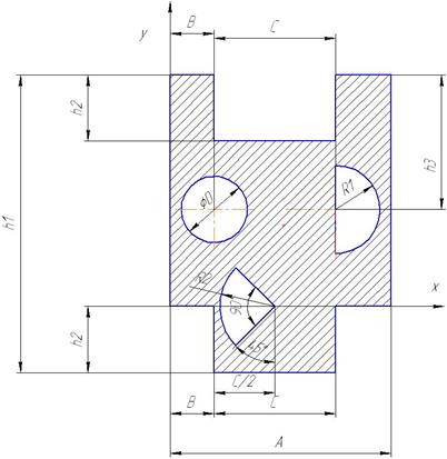 Рассмотрим решение задачи на определение центра тяжести плоской фигуры, состоящей из стандартных профилей и геометрических фигур (рис.6.10).