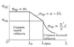 Критическое напряжение определяется по формуле σ кр = а — bλ. где а и b - коэффициенты, зависящие от материала; их значения представлены в таблице. На рис. 9.57 представлена зависимость критического напряжения от гибкости стержня.