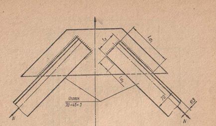 Решение. Допускаемое значение растягивающего усилия для каждого стержня [ F ] = Ауг ∙ [σ ]Р = 559∙ 160 = 89, 5∙ 103 Н. Здесь Ауг = 5, 59 см2 (ГОСТ 8510-72). Размеры листа определяются углом наклона стержней и длиной фланговых швов (l ф1 , l ф2). Примем величину катета k равной толщине полки уголка (k = 5 мм). Допускаемое усилие для лобового шва при расчете на срез: [ F л] = 0, 7∙ k ∙ l л ∙ [τ ]ср = 0, 7∙ 5∙ 70∙ 104 = 25, 5∙ 103 Н. Допускаемое напряжение среза (табл. 12) [τ ]ср = 0, 65 [σ ]Р = 0, 65∙ 160 = 104 Н/мм2. Усилие, воспринимаемое фланговыми швами [ F ф] = [ F ] - [ F л] =89, 5 ‑ 25, 5 = 64, 0 кН. Это усилие распределяется между фланговыми швами обратно пропорционально расстояниям от них до продольной оси уголка. Воспользовавшись уравнением статики, найдем
