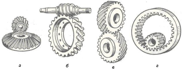 Рис. 10.15. Зубчатые передачи: а – коническая: б – червячная; в – винтовая; г – цилиндрическая с внутренним зацеплением