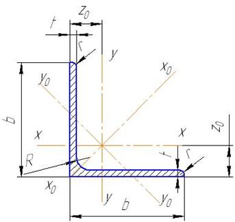 Размеры и справочные величины. Обозначения: B ‑ ширина большей полки b ‑ ширина меньшей полки t ‑ толщина полки R ‑ радиус внутреннего закругления r ‑ радиус закругления полки J ‑ момент инерции W ‑ момент сопротивления x0, y0 ‑ расстояние от центра тяжести до наружных граней полки