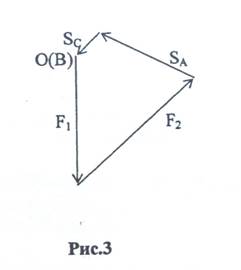 Из произвольно выбранной точки 0 откладываем отрезок, соответствующий величине и направлению силы F1m. из конца этого отрезка откладываем отрезок F2m. так как условием равновесия сходящейся системы сил является замкнутость силового многоугольника, то из начала отрезка F1m откладываем линию, параллельную вектору SC, а из конца отрезка F2m откладываем линию, параллельную вектору SA. Точка их пересечения является вершиной силового многоугольника (рис.30).
