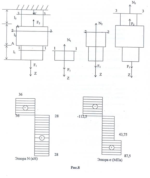 Пример 1 (для контрольной работы № 2). Для данного ступенчатого бруса построить эпюры продольных сил и нормальных напряжений. Определить абсолютное удлинение (укорочение) бруса (рис.8) Дано: F1 = 28 кН; F2 = 64 кН; 11 = 2, 4 м; 12 = 2, 2 м; 13 = 2, 0 м; А = 3, 2 см2; Е = 2, 1 х 105 Па.