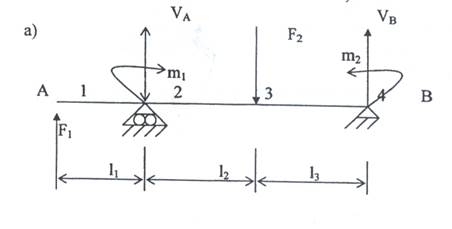 Пример 2 (для контрольной работы № 2). Для двутавровой балки построить эпюры поперечных сил Q и изгибающих моментов М. Подобрать сечение стального двутавра, приняв σ у = 160 МПа. Дано: F1 = 24 кН; F2 = 36 кН; 11 = 2, 0 м; 12 = 3, 0 м; 13 = 3 м; m1 = 18 кН· м; m2 = 24кН· м. Решение. Составляем уравнения равновесия параллельной системы сил, из которых определяем опорные реакции балки. _ Ʃ МА (FR) = F1 2, 0 + m1 + F2 3, 0 – m2 – VB 6, 0 = 0; (1) _ Ʃ МB (FR) = F1 8, 0 + m1 + VA 6, 0 – F2 3, 0 – m2 = 0; (2)