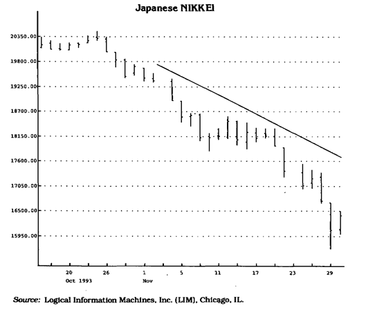 Рис. 1.1 Обратите внимание, что постепенное снижение цен отражено нисходящей линией " предложения"; ценовые пики и впадины также последовательно снижаются.