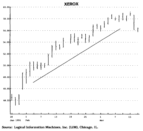 Движение цен диктуется спросом и предложением. Если спрос превышает предложение, то цены растут; и, наоборот, если предложение превышает спрос, то цены падают. Все экономисты разделяют эти основополагающие принципы. Графически два вышеупомянутых феномена изображаются так, как показано на рис. 1.1 и рис. 1.2: предложение — нисходящей линией, спрос — восходящей. Сложность заключается в выборе особых точек, через которые проходят эти прямые линии (см. рис. 1.3). Как правило, аналитик привносит изрядную долю субъективизма в построение линий тренда. Так, движение цен на рынке принято рассматривать в ретроспективе — от прошлого к будущему, поэтому и даты на графике перечисляются слева направо. Соответственно линии спроса и предложения строятся и располагаются на графике слева направо. Интуиция подсказывает, что это неверно. Движение цен в настоящий момент гораздо важнее, чем движение рынка в прошлом. Иными словами, стандартные линии тренда должны вычерчиваться справа налево так, чтобы в правой части графика были самые последние данные о состоянии рынка. Поначалу это может показаться необычным, но мой собственный опыт и обширные наблюдения подтверждают целесообразность такого подхода. Не стоит жертвовать точностью и логикой во имя простоты. Общепринятая процедура построения множества линий тренда, из которых одна милостиво полагается верной,