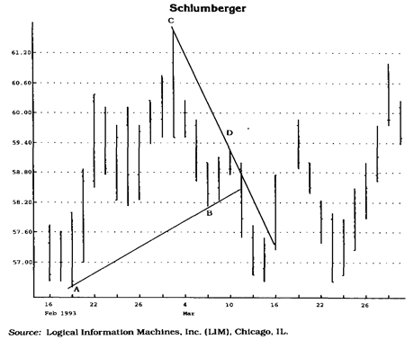 Рис. 1.31 Хотя цены поднялись выше ТО-линяи предложения А-В, на следующий день цена в момент открытия была ниже цены закрытия в день прорыва и затем продолжала падать, опустившись ниже нисходящей линии А-В. Такая динамика цен делает прорыв недействительным.