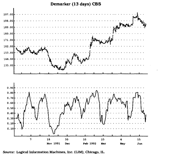 Индикатор Демарка строится на основе следующих сопоставлений. Внутридневной максимум текущего дня сравнивается с внутридневным максимумом предыдущего дня. Если внутридневной максимум текущего дня выше, то регистрируется соответствующая разность. Если внутридневной максимум меньше или равен внутридневному максимуму предыдущего дня, то регистрируется нулевое значение. Затем полученные таким образом разности за 13 дней суммируются. Полученное значение становится числителем индикатора Демарка и делится на ту же самую величину плюс сумма разностей между ценовыми минимумами предшествующего и текущего дней за 13 дней. Если ценовой минимум текущего дня больше того, который был день тому назад, то фиксируется нулевое значение. Таким образом, создан простой и чувствительный индикатор, способный предсказывать поведение цен. На рисунках 3.7 и 3.8 это явление наглядно продемонстрировано. На графике показано, как индикатор колеблется от О до 100. Когда показания индикатора опускаются ниже отметки 30, то ожидается разворот цен вверх. Когда показания инди катора поднимаются выше отметки 70, то ожидается разворот цен вниз. Как и индикатор REI, индикатор Демарка предназначен для выявления областей с высоким и низким риском для покупки. Но если ВЫ, чтобы определить истинную тенденцию на рынке, сравнивает цены через день, индикатор Демарка сравнивает цены данного и предыдущего дней. Кроме того, REI рассчитывается с помощью ценовых значений, полученных за 8 дней, а Индикатор Демарка — за 13 дней. (Временной параметр обоих индикаторов может быть свободно изменен.) Ниже приводится текст компьютерной программы расчета индикатора Демарка (см. таблицу 3.3).
