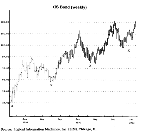 Такой способ прогнозирования развития рынка достаточно субъективен и, в силу непостоянства циклических периодов, не может быть проанализирован или проверен статистически. На практике оказывается, что интерпретация циклов достаточно туманна; часто там, где предсказывают появление вершины или основания рынка, наблюдается прямо противоположная картина. Такая непредсказуемость вызывала у меня некоторую озабоченность. Поэтому я провел несколько экспериментов, пытаясь применить для определения циклов временную последовательность Фибоначчи, однако полученные результаты, хоть и были чуть лучше, в принципе не содержали ничего необычного. Я всегда относился скептически к попыткам определять ценовые пики и впадины при помощи теории циклов. Я не могу понять, почему поведение цен должно повторяться через некоторые, произвольно выбранные промежутки времени. Кроме того, мои исследования показывают, что динамика цен на некоторых временных интервалах вообще не имеет никакого значения.