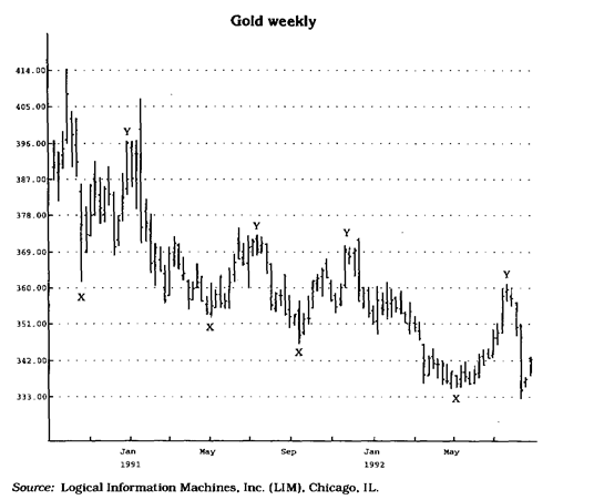 Рис. 7.2 Каждый ценовой минимум находится примерно на расстоянии 10 недель от последующей максимальной цены закрытия. Периоды обозначены буквами Х и Y.