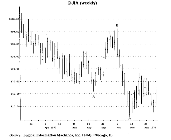 Рис. 7.3 Обратите внимание на десятидневное возрастание цены (А-В) и ее быстрый спад в течение пяти дней до нового минимума (С)