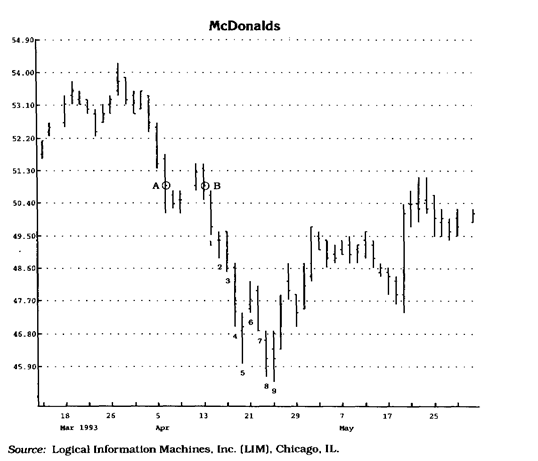 Рис. 7.9 В день. предшествующий первому дню установочного набора на продажу, цена закрытия (А) была ниже цены закрытия четыре дня тому назад (В).