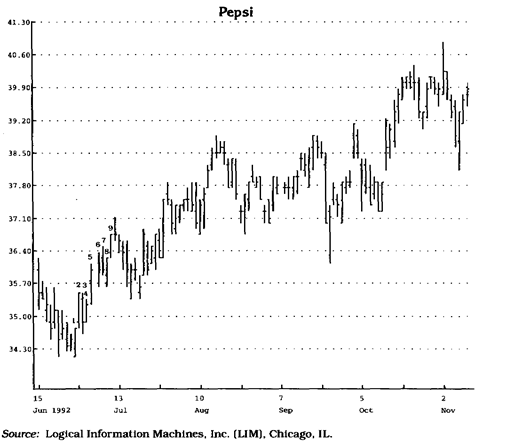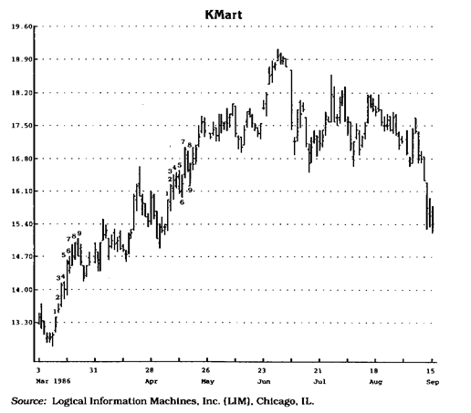 Рис, 7-6 Цена закрытия в день В больше или равна цене закрытия в день А. Цена закрытия на следующий день меньше цены закрытия четыре дня тому назад, и этому дню присваивается номер 1 в установочном наборе. Обратите внимание, что девятый день оказался последним днем нисходящей тенденции — рынок достиг основания.