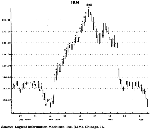 Как это видно из приведенных примеров, довольно часто сразу после формирования девятидневной установки происходит краткосрочный подъем цен или даже перелом нисходящей тенденции. Если только рынок не находится в свободном падении или в режиме краткосрочной коррекции при восходящей тенденции, то эти отрывистые " покашливания" представляют собой лишь небольшую отсрочку в развитии нисходящей тенденции, после которой падение цен продолжится. Чтобы возник сигнал на продажу, на рынке должны сложиться предпосылки для понижения цен. Условия для продажи прямо противоположны условиям для покупки. Установка на покупку требует, чтобы в течение девяти последовательных дней цены закрытия были меньше, чем цены закрытия за четыре дня до каждого дня этой последовательности. Установка на продажу требует, чтобы в течение девяти последовательных дней цены закрытия были больше, чем цены закрытия за четыре дня до каждого дня этой последовательности. Например, если цена закрытия в пятницу была больше, чем цена закрытия в понедельник на той же неделе (предполагается, что торговля имела место также во вторник, среду и четверг), то этим определяется один день возможного установочного набора из девяти дней. Если цена закрытия в пятницу была равна или меньше цены закрытия в понедельник, то этот день нельзя расценивать как один из дней девятидневного установочного набора на продажу. Требования, соответствующие установке на продажу, показаны на рис. 7.7 и 7.8.