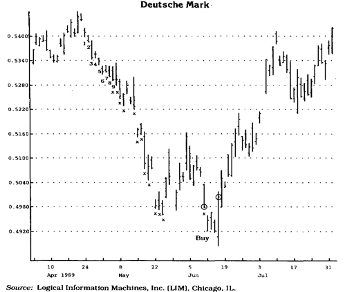 Чтобы возник сигнал к покупке, рынок должен быть прежде всего предрасположен к повышению. Мои исследования показали, что условия для покупки создаются благодаря особому сочетанию цен закрытия в течение девяти последовательных дней. В частности, установка на покупку сформирована, если зарегистрировано, что в течение, по меньшей мере, девяти последовательных дней цены закрытия были меньше, чем цены закрытия за четыре дня до каждого дня этой последовательности. Например, если цена закрытия в пятницу меньше, чем цена закрытия в понедельник на той же неделе (предполагается, что торговля имела место также во вторник, среду и четверг), то этим определяется один день возможного установочного набора из девяти дней. Однако если цена закрытия в пятницу была равна или больше цены закрытия в понедельник, то этот день нельзя расценивать как один из дней девятидневного установочного набора на покупку. Требования, соответствующие установке на покупку, показаны на рис. 7.4 и 7.5.