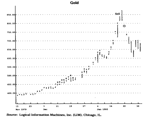 Рис. 7.32 Обратите внимание на " подскок" цены: он произошел уже после ценового пика и тринадцатого дня отсчета, однако послужил надежным подтверждением того, что нужно продавать.