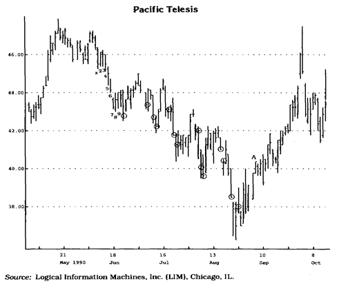 Рис. 7.40 Как видно из графика, возрастающий девятидневный установочный набор, отмеченный цифрами, не превзошел максимальный уровень убывающего установочного набора, начавшегося за 11 дней до октябрьского ценового минимума.