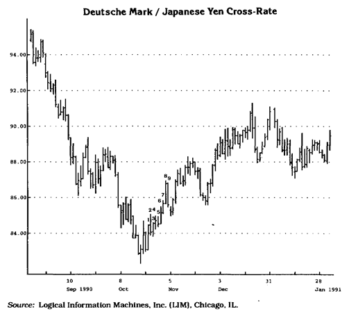 В обоих случаях позиция должна быть закрыта, как только последующая цена закрытия пересечет уровень стоп-лосс. Более консервативной является вторая методика ограничения убытков. Как при покупке, так и при продаже в этом случае день для расчета уровня стоп-лосс выбирается точно так же. Однако вместо использования истинного диапазона при покупке уровень стоп-лосс определяется вычитанием из минимальной цены разницы между ценой закрытия и минимальной ценой; при продаже уровень стоп-лосс определяется прибавлением к максимальной цене разницы между максимальной ценой и ценой закрытия. Как и в первой методике ограничения убытков, позиция должна быть закрыта, как только последующая цена закрытия пересечет уровень стоп-лосс. Обе методики основаны на предположении, что рынок выразил некоторый пессимизм в тот день, когда была зафиксирована экстремальная цена, и пересечение этого уровня ценой закрытия являлось бы отклонением от нормального поведения цен и, следовательно, представляло бы собой угрозу действующему сигналу. Я был убежден, что система, описанная в данной главе, хорошо работает применительно к дневным графикам. Время от времени я пробовал анализировать с ее помощью графики, построенные на более коротких временных интервалах, и обнаружил, что в этих случаях она также работает хорошо. Хотя я и не рекомендую использование Секвенты™ для анализа каких-либо графиков, кроме дневных, рисунок 7.44 иллюстрирует ее успешное применение на минутном графике японской иены.