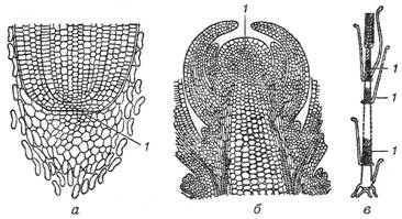 Мал. 1. Твірна тканина (1): верхівкова (а — кореня, б — стебла) і вставна (в)