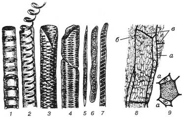 Мал. 2. Основна тканина: 1 — аеренхіма стебла водяної рослини з великими міжклітинниками (а); 2 — запаслива паренхіма бульби з крохмалем провідними й арматурними тканинами. Розрізняють три групи основних тканин: асиміляційну, запасливу і повітроносну (аеренхіму). Основна асиміляційна тканина розміщена в усіх зелених частинах рослин. Її клітини містять хлоропласти, в яких здійснюється процес фотосинтезу. Основна запаслива тканина заповнює м'які частини листків, плодів, серцевину стебел та коренів. У її клітинах відкладаються на запас поживні речовини. Основна повітроносна тканина багата, як правило, на міжклітинні проміжки, заповнені повітрям. Міжклітинники, сполучаючись у загальну сітку, забезпечують газообмін рослин. Провідна тканина — тканина, по якій у рослині переміщуються вода та інші речовини. До її складу входять судини (трахеї), трахеїди і ситоподібні трубки (мал. 3). Судини (трахеї) — це довгі трубки, що формуються з багатьох розміщених одна над одною клітин, поперечні стінки яких руйнуються. Поздовжні стінки судин нерівномірно потовщені (здерев'янілі), цитоплазма відмирає. Трахеїди — це видовжені клітини з косими поперечними перетинками, якими вони сполучаються одна з одною, утворюючи суцільний ланцюг. Як і трахеї, це мертві клітини з нерівномірно здерев'янілими стінками. Здерев'яніння (потовщення) може мати вигляд кілець, спіралей, драбинок, сіток. Завдяки потовщенням трахеї і трахеїди протистоять стискуванню і розтягуванню. Подібність будови трахей і трахеїд пояснюється єдиною функцією. По них вода і розчинені в ній мінеральні солі рухаються від коренів до надземних частин рослини. Судини і трахеїди функціонують кілька років, а потім закупорюються внаслідок діяльності паренхімних клітин деревини. Ситоподібні трубки — видовжені, живі клітини, що сполучаються між собою за допомогою поперечних перетинок