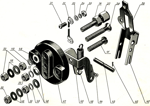 Рис. 1.4 31 – Винт М5-6 х 8.36.016 ГОСТ 17473-80 32 – Вывод (325.040) – 0, 004 кг 33 – Шайба 5.01.10.016 ГОСТ 11371-78 34 – Шайба 5.65Г.05 ГОСТ 6402-70 35 – Гайка М5-6Н.5.016 ГОСТ 5927-70 36 – Болт клеммный (325.103) – 0, 04 кг 37 – Гайка (325.133) – 0, 01 кг 38 – Винт (325.126) – 0, 01 кг 39 – Держатель контакта (325.030) – 0, 02 кг 40 – Рычаг (325.107) – 0, 045 кг 41 – Винт (325.145) – 0, 008 кг 42 – Шплинт 1, 6 х 10-05 ГОСТ 397-79 – 2 шт. 43 – Ось (325.106) – 0, 007 кг 44 – Винт МЗ-6 х 8.36.016 ГОСТ 17473-80 45 – Кронштейн (325.143) – 0, 05 кг 46 – Пружина (325.141) – 0, 005 кг 47 – Панель (325.102-3) – 0, 066 кг 48 – Шайба 6.01.10.05 ГОСТ 11371-78 – 9 шт. 49 – Шайба 6.65Г.05 ГОСТ 6402-70 – 3 шт. 50 – Гайка 2М6-6Н.5.019 ГОСТ 5915-70 – 5 шт. Авторежим электропневматический (1/5)