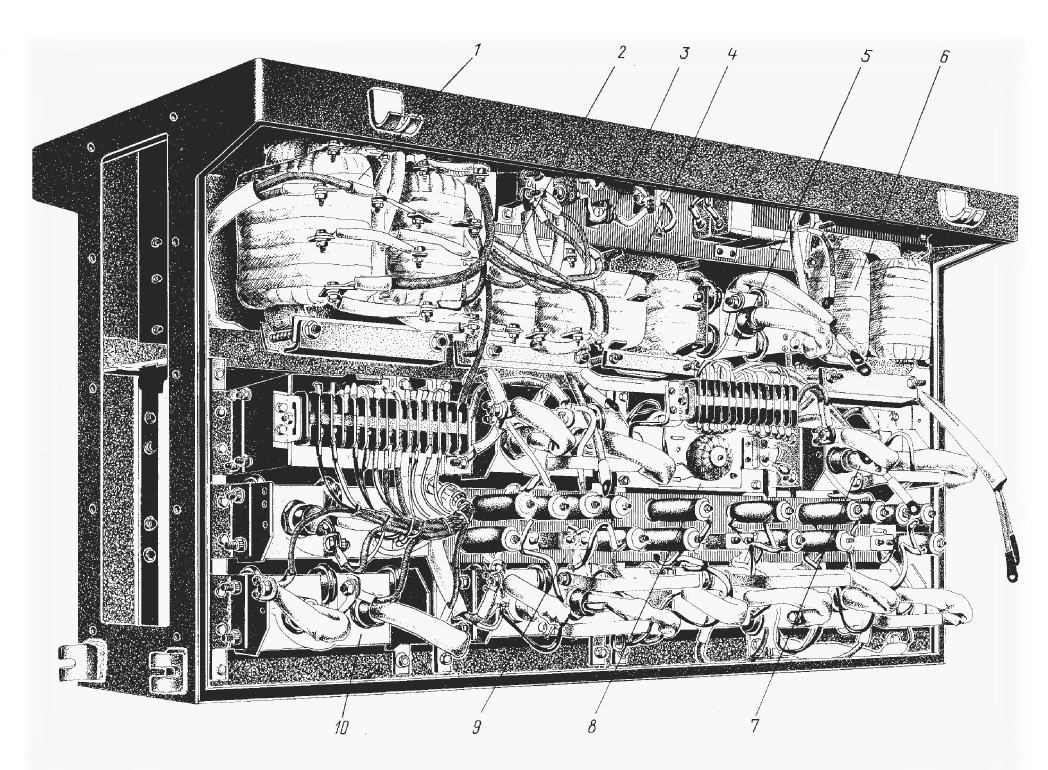 1 - блок дросселей насыщения - 1шт (6ТЦ.272.021) 2 - дроссель входного фильтра - 2шт (6ТЦ.271.011) 3 - панель защитная - 1шт (6ТЦ.366.000) 4 - блок питания - 1шт (6ТЦ.697.002) 5 - блок вентильный - 1шт (6ТЦ.696.002) 6 - блок конденсаторов - 1шт (6ТЦ.272.019) 7 - блок конденсаторов - 1шт (6ТЦ.272.018) 8 - блок коммутирующих конденсаторов - 1шт (6ТЦ.272.020)