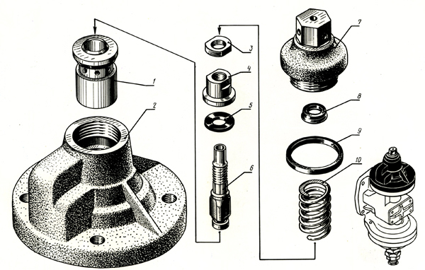 1 – седло (337.319) – 0, 3 кг 2 – крышка верхняя (337.303) – 1, 23 кг 3 – контргайка (305.165) – 0, 006 кг 4 – гнездо (305.164) – 0, 03 кг 5 – уплотнение клапана (305.163) – 0, 003 кг 6 – шток (305.162) – 0, 05 кг 7 – цоколь (305.481) – 0, 342 кг 8 – манжета воздухораспределителя (305.156) – 0, 002 кг 9 – прокладка (305.155) – 0, 003 кг 10 – пружина (305.192) – 0, 02 кг