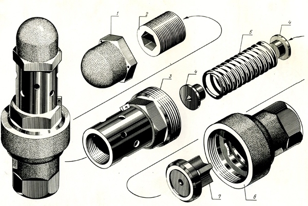 Рис. 1.1 ГОСТ 2610-75 1 - крышка (Э.216.03) – 1 шт. – 0, 21 кг 2 – винт регулировочный (Э.216.04) – 1 шт. – 0, 14 кг 3 – стакан клапана (Э.216.02) – 1 шт. – 0, 51 кг 4 – шайба (Э.216.06) – 2 шт. – 0, 085 кг 5 – пружина (Э.216.07) – 1 шт. – 0, 14 кг 6 – корпус (Э.216.01) – 1 шт. – 0, 7 кг 7 – клапан (Э.216.05) – 1 шт. – 0, 13 кг